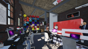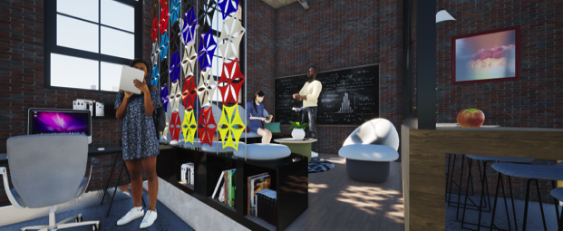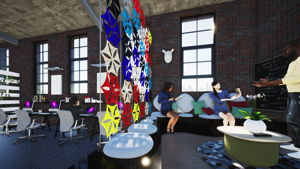 Our design solution creates an informal workspace with colourful purpose made feature screen for a Brainstorming raised pod. The layout includes a Boardroom, Open Plan Workspace, storage space, hot desks & Kitchenette all in a casual informal setting in keeping with the Marketing Departments culture.