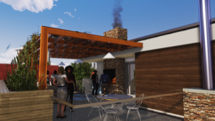 Both the lounge and dining areas open completely to the outdoors to take advantage of the Highveld summers. A roof top patio with a steel & timber frame landscaped with creepers creates the ultimate outdoor entertainment lounge area in dappled sunlight.